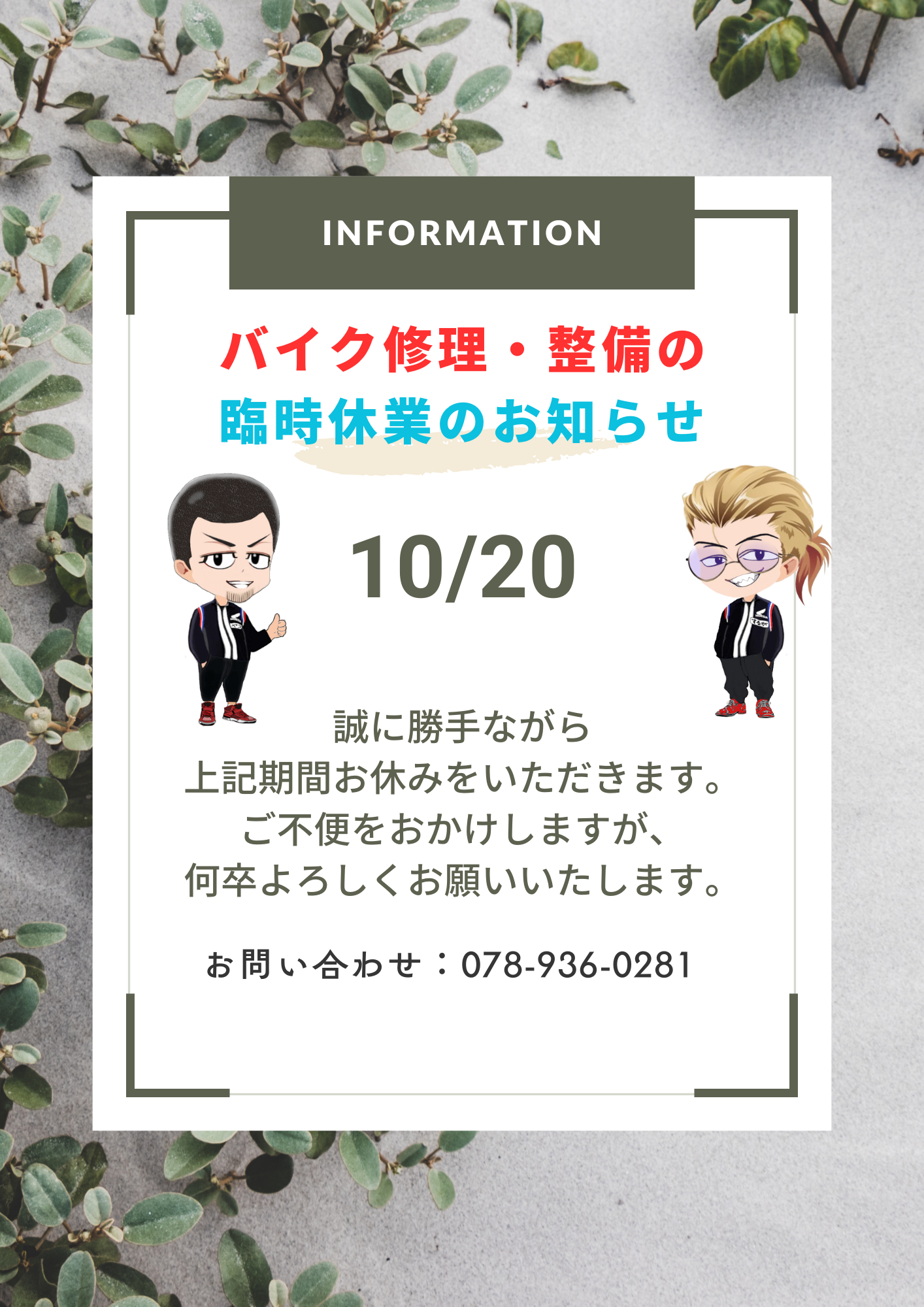 2025.10.18 / お知らせ 【重要】バイク修理・メンテナンスの休業のお知らせ 10/20(月)はメンテナンス作業やオイル交換などのご対応不可となっておりますのでご了承のほどお願いいたします。 バイクのご契約や商談等は、ご対応させて頂きますのでご来店の程、お待ちしております。 2025.10.18 / お知らせ PREVIOUS BACK Categories LP お知らせ Archives 2025年10月 (1) 2025年8月 (1) 2025年2月 (1) 2024年12月 (1) 2024年8月 (1) 2024年4月 (1) 2023年12月 (1) 2023年9月 (1) 2023年8月 (1) 2023年7月 (3) 2023年6月 (1) 2023年5月 (1) 2023年4月 (2) 2023年1月 (1) 2022年12月 (1) 2022年9月 (1) 2022年7月 (4) 2022年6月 (2) 2022年4月 (1) 2022年3月 (1)